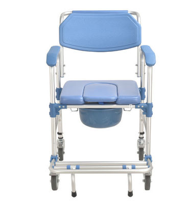 Bingkai paduan aluminium biru khusus rumah sakit PP kursi toilet roda empat dengan rem